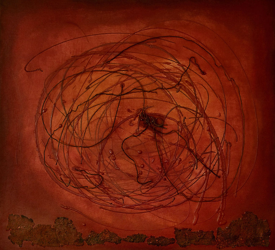 Óxido nº 2 - Óxido e hidróxido de hierro y alambre oxidado sobre tela en madera. 110 x 70 cm